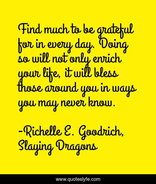 This page presents the quote "Find much to be grateful for in every day. Doing so will not only enrich your life, it will bless those around you in ways you may never know.". Author of this quote is Richelle E. Goodrich, Slaying Dragons. This quote is about gratitude, richelle-e-goodrich, bless-others, blessings, richelle, grateful, thankfulness, richelle-goodrich,.