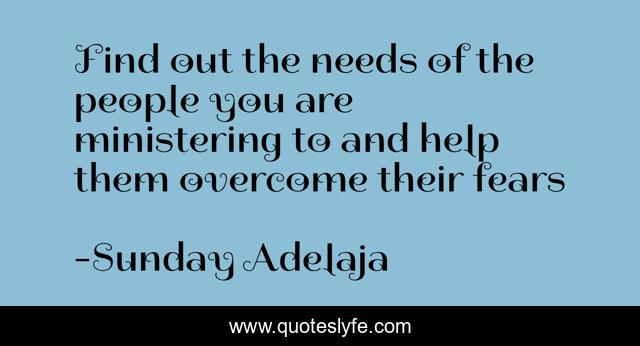 This page presents the quote "Find out the needs of the people you are ministering to and help them overcome their fears". Author of this quote is Sunday Adelaja. This quote is about ministration, life, blessing, finance, meeting-needs, ministry, money, work, needs,.