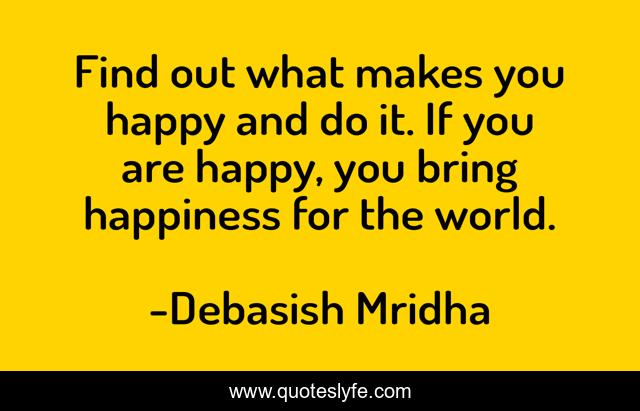 This page presents the quote "Find out what makes you happy and do it. If you are happy, you bring happiness for the world.". Author of this quote is Debasish Mridha. This quote is about happy, life, love, knowledge, inspirational, intelligence, philosophy, wisdom, affection,.