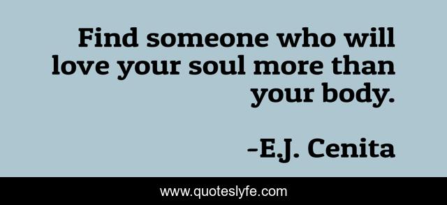 This page presents the quote "Find someone who will love your soul more than your body.". Author of this quote is E.J. Cenita. This quote is about love, relationship, relationship-advice, quotes-and-saying, happiness, inspirational, couple-advice, enthusiasm, affection,.