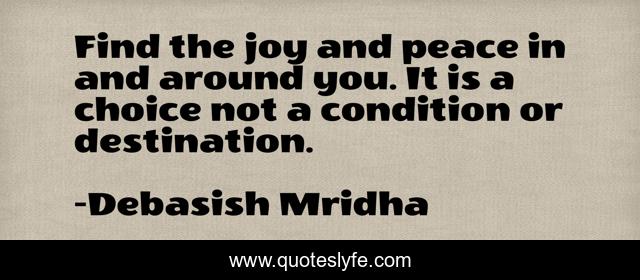 This page presents the quote "Find the joy and peace in and around you. It is a choice not a condition or destination.". Author of this quote is Debasish Mridha. This quote is about life, love, knowledge, inspirational, intelligence, philosophy, wisdom, quotes, affection,.