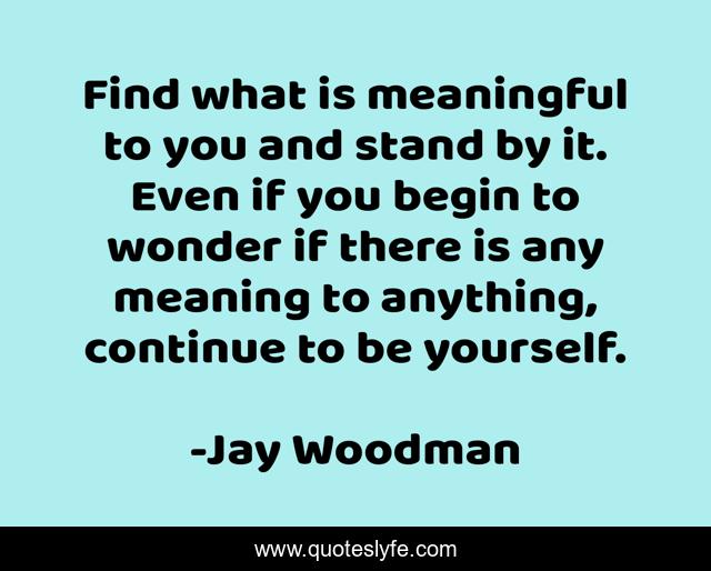 This page presents the quote "Find what is meaningful to you and stand by it. Even if you begin to wonder if there is any meaning to anything, continue to be yourself.". Author of this quote is Jay Woodman. This quote is about meaning, meaningful, standards,.
