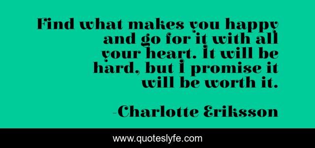 This page presents the quote "Find what makes you happy and go for it with all your heart. It will be hard, but I promise it will be worth it.". Author of this quote is Charlotte Eriksson. This quote is about heart, inspiring, motivating, artist, songwriter, hard, life, be-happy, promise,.