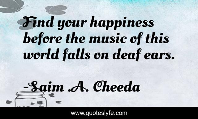 This page presents the quote "Find your happiness before the music of this world falls on deaf ears.". Author of this quote is Saim .A. Cheeda. This quote is about deaf, subliminal, music, world, understand, ears, find, happiness, before,.