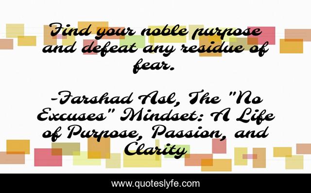 This page presents the quote "Find your noble purpose and defeat any residue of fear.". Author of this quote is Farshad Asl, The "No Excuses" Mindset: A Life of Purpose, Passion, and Clarity. This quote is about fear, defeat, nobel-purpose, your-purpose-in-life,.