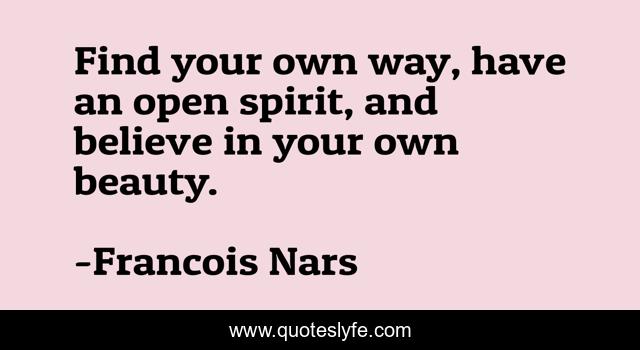 This page presents the quote "Find your own way, have an open spirit, and believe in your own beauty.". Author of this quote is Francois Nars. This quote is about believe, find, way,.