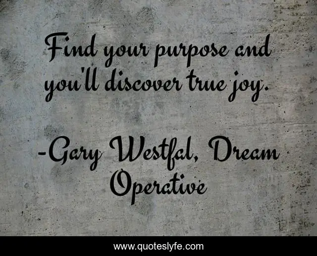 This page presents the quote "Find your purpose and you'll discover true joy.". Author of this quote is Gary Westfal, Dream Operative. This quote is about joy, dream, discover, purpose,.
