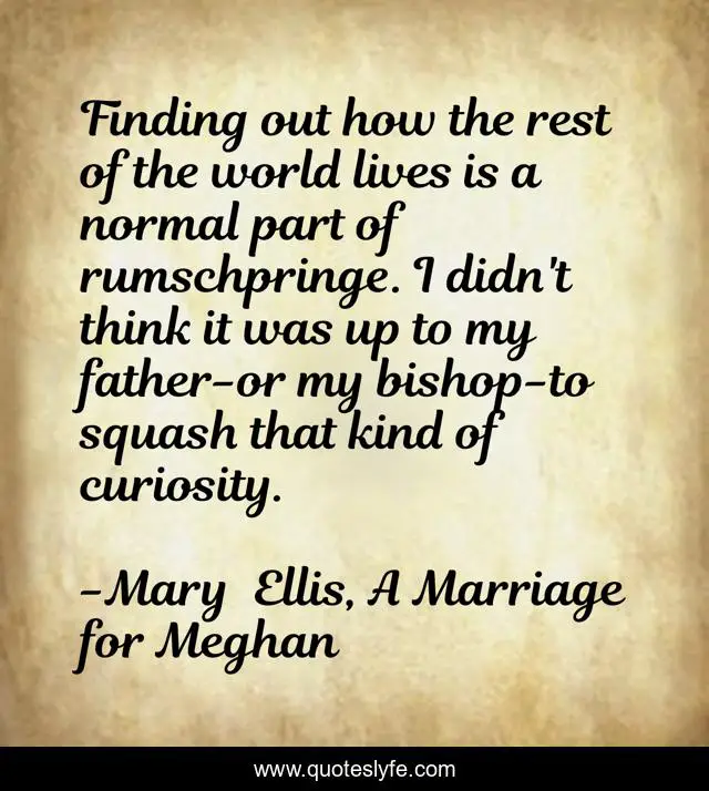 This page presents the quote "Finding out how the rest of the world lives is a normal part of rumschpringe. I didn't think it was up to my father-or my bishop-to squash that kind of curiosity.". Author of this quote is Mary Ellis, A Marriage for Meghan. This quote is about life, life-experience,.
