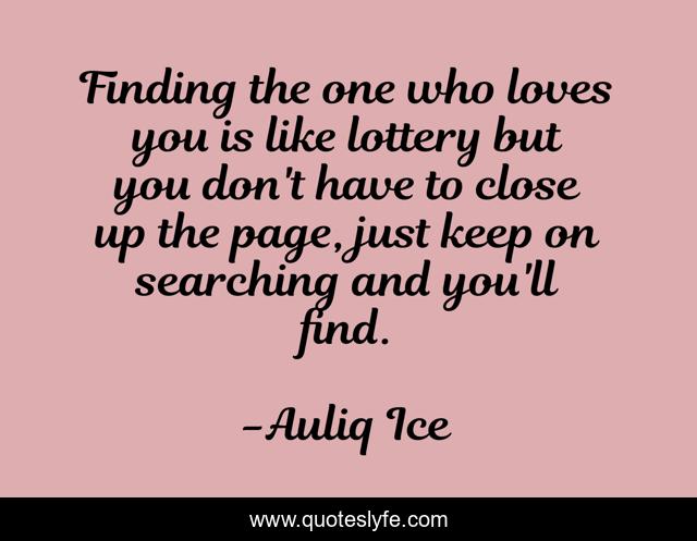 This page presents the quote "Finding the one who loves you is like lottery but you don't have to close up the page, just keep on searching and you'll find.". Author of this quote is Auliq Ice. This quote is about falling-in-love, love, love-at-first-sight, dating-advice, marriage, dating, affection,.
