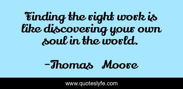 This page presents the quote "Finding the right work is like discovering your own soul in the world.". Author of this quote is Thomas Moore. This quote is about life, work, life-lessons,.