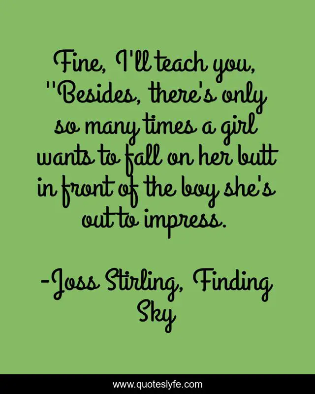 This page presents the quote "Fine, I'll teach you, ''Besides, there's only so many times a girl wants to fall on her butt in front of the boy she's out to impress.". Author of this quote is Joss Stirling, Finding Sky. This quote is about humor, sky,.