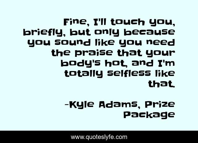 This page presents the quote "Fine, I'll touch you, briefly, but only because you sound like you need the praise that your body's hot, and I'm totally selfless like that.". Author of this quote is Kyle Adams, Prize Package. This quote is about funny, comedy,.