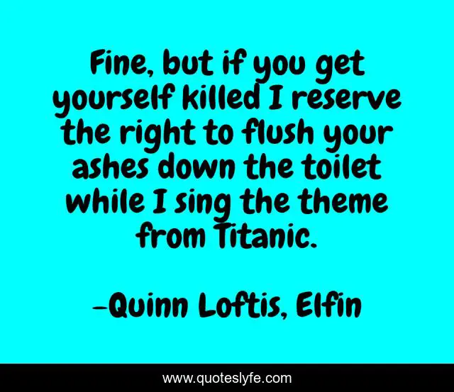 This page presents the quote "Fine, but if you get yourself killed I reserve the right to flush your ashes down the toilet while I sing the theme from Titanic.". Author of this quote is Quinn Loftis, Elfin. This quote is about humor, humour,.