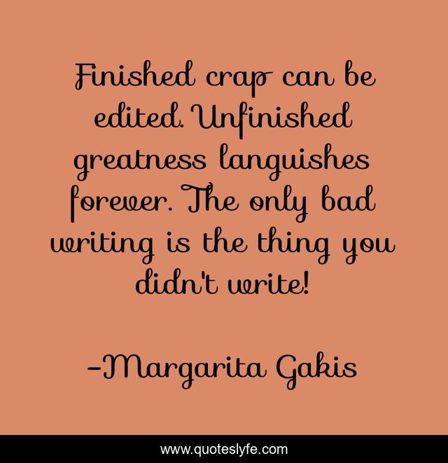 This page presents the quote "Finished crap can be edited. Unfinished greatness languishes forever. The only bad writing is the thing you didn't write!". Author of this quote is Margarita Gakis. This quote is about getting-things-done, writing,.