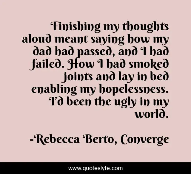 This page presents the quote "Finishing my thoughts aloud meant saying how my dad had passed, and I had failed. How I had smoked joints and lay in bed enabling my hopelessness. I’d been the ugly in my world.". Author of this quote is Rebecca Berto, Converge. This quote is about new-adult, emotional, romance, contemporary, fiction,.
