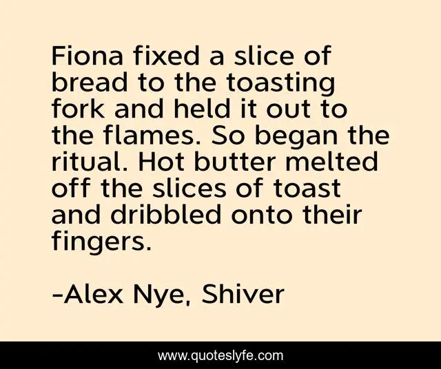 This page presents the quote "Fiona fixed a slice of bread to the toasting fork and held it out to the flames. So began the ritual. Hot butter melted off the slices of toast and dribbled onto their fingers.". Author of this quote is Alex Nye, Shiver. This quote is about butter, food, melted, toast,.