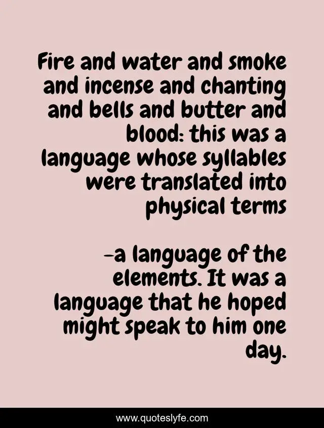 "a language of the elements. It was a language that he hoped might speak to him one day. Quotes." Quoteslyfe.com, 2025. Tue. 09 Dec. 2025. <https://www.quoteslyfe.com/quote/Fire-and-water-and-smoke-and-incense-159169>.
