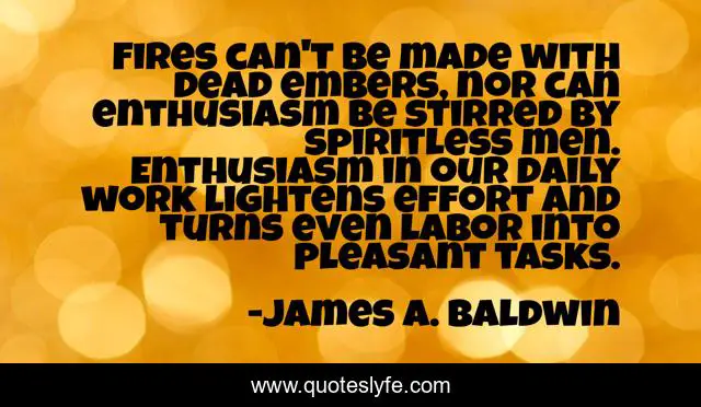 This page presents the quote "Fires can't be made with dead embers, nor can enthusiasm be stirred by spiritless men. Enthusiasm in our daily work lightens effort and turns even labor into pleasant tasks.". Author of this quote is James A. Baldwin. This quote is about men, effort, daily,.