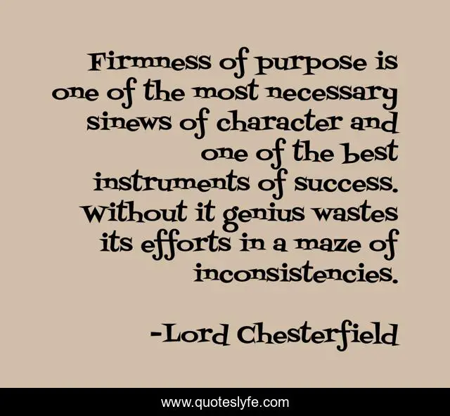 This page presents the quote "Firmness of purpose is one of the most necessary sinews of character and one of the best instruments of success. Without it genius wastes its efforts in a maze of inconsistencies.". Author of this quote is Lord Chesterfield. This quote is about commitment, belief,.