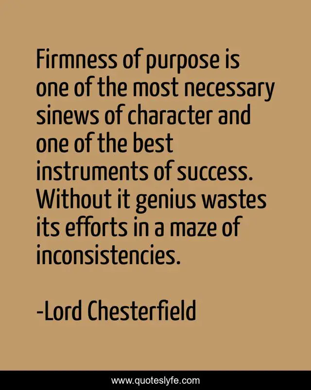 This page presents the quote "Firmness of purpose is one of the most necessary sinews of character and one of the best instruments of success. Without it genius wastes its efforts in a maze of inconsistencies.". Author of this quote is Lord Chesterfield. .