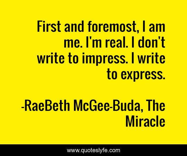 This page presents the quote "First and foremost, I am me. I'm real. I don't write to impress. I write to express.". Author of this quote is RaeBeth McGee-Buda, The Miracle. This quote is about enthusiasm, inspirational, writing,.