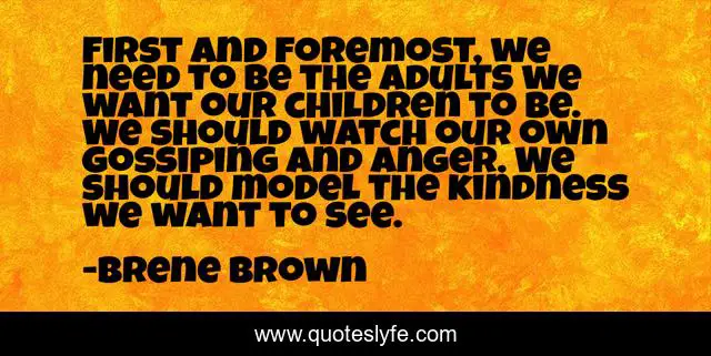 This page presents the quote "First and foremost, we need to be the adults we want our children to be. We should watch our own gossiping and anger. We should model the kindness we want to see.". Author of this quote is Brene Brown. This quote is about kindness, children,.