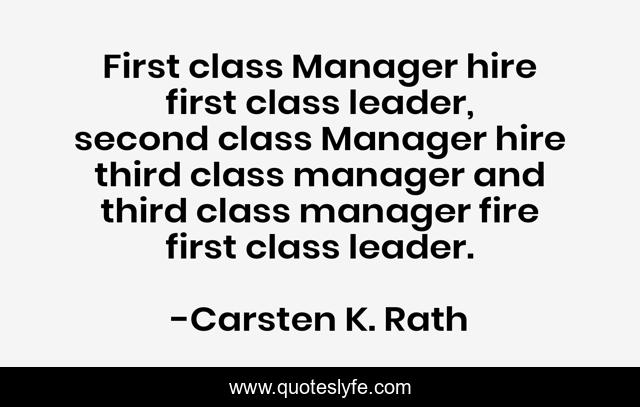 This page presents the quote "First class Manager hire first class leader, second class Manager hire third class manager and third class manager fire first class leader.". Author of this quote is Carsten K. Rath. This quote is about manager, hotel, leader, rath,.