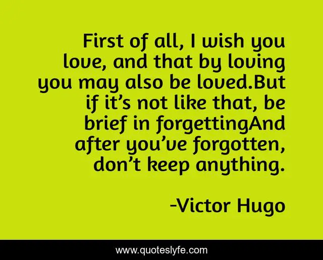 This page presents the quote "First of all, I wish you love, and that by loving you may also be loved.But if it’s not like that, be brief in forgettingAnd after you’ve forgotten, don’t keep anything.". Author of this quote is Victor Hugo. This quote is about heartbreak, love, unrequited-love, affection,.