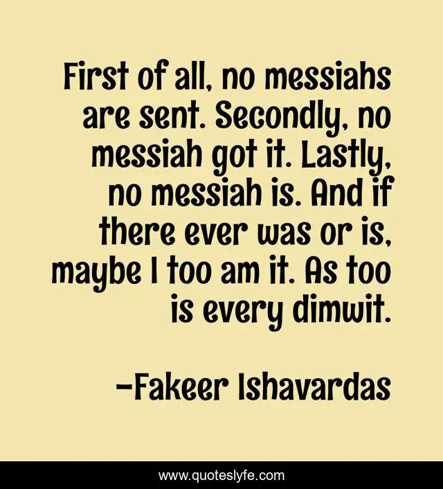 "Fakeer Ishavardas Quotes." Quoteslyfe.com, 2025. Fri. 05 Dec. 2025. <https://www.quoteslyfe.com/quote/First-of-all-no-messiahs-are-sent-44850>.