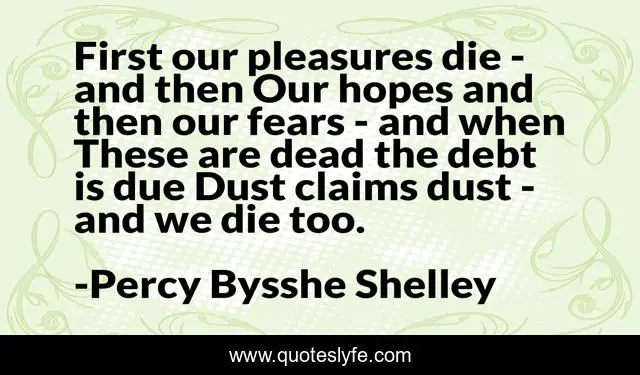 This page presents the quote "First our pleasures die - and then Our hopes and then our fears - and when These are dead the debt is due Dust claims dust - and we die too.". Author of this quote is Percy Bysshe Shelley. .