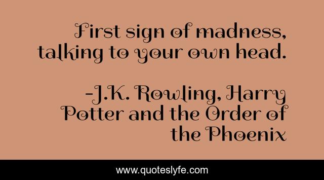 This page presents the quote "First sign of madness, talking to your own head.". Author of this quote is J.K. Rowling, Harry Potter and the Order of the Phoenix. This quote is about madness, insanity,.