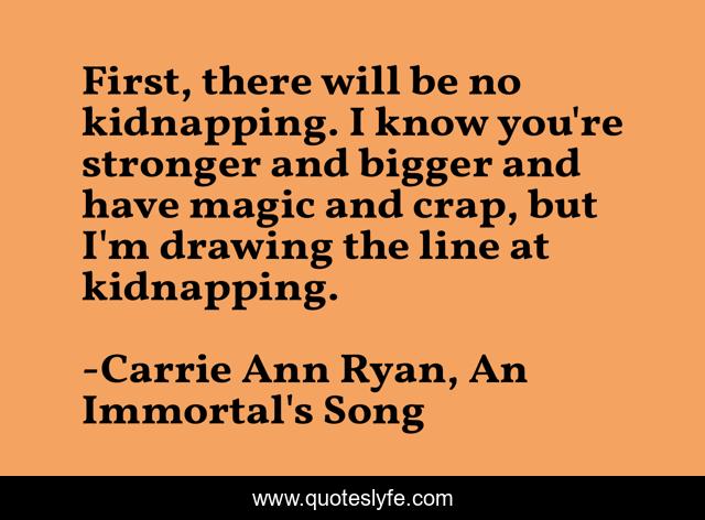 This page presents the quote "First, there will be no kidnapping. I know you're stronger and bigger and have magic and crap, but I'm drawing the line at kidnapping.". Author of this quote is Carrie Ann Ryan, An Immortal's Song. This quote is about siren, menage-a-trois, paranormal-romance, merman, fae,.