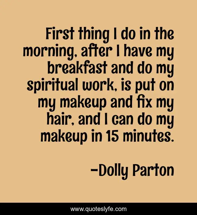 This page presents the quote "First thing I do in the morning, after I have my breakfast and do my spiritual work, is put on my makeup and fix my hair, and I can do my makeup in 15 minutes.". Author of this quote is Dolly Parton. This quote is about spiritual, work, breakfast,.