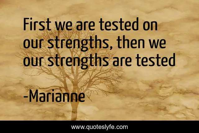 This page presents the quote "First we are tested on our strengths, then we our strengths are tested". Author of this quote is Marianne. This quote is about sorrow, life, tests-of-nature,.