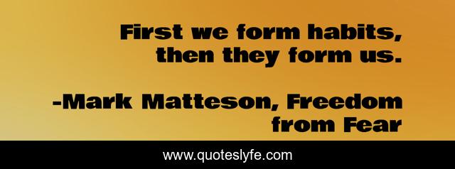 This page presents the quote "First we form habits, then they form us.". Author of this quote is Mark Matteson, Freedom from Fear. This quote is about a-thought, advice, us, habits, what-forms-us, realization,.