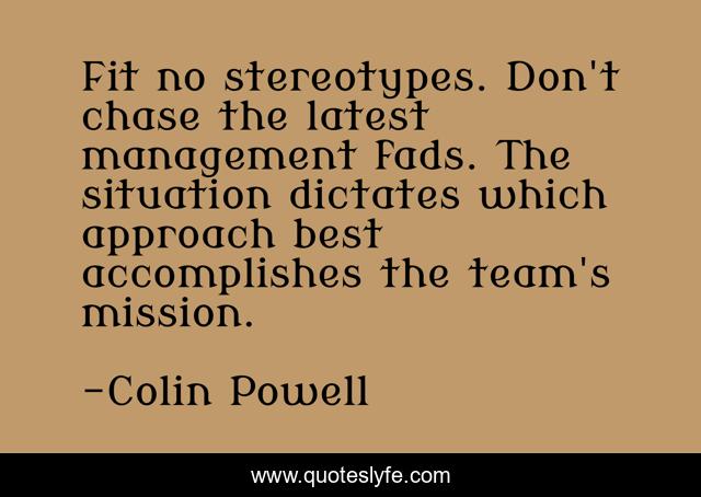 This page presents the quote "Fit no stereotypes. Don't chase the latest management fads. The situation dictates which approach best accomplishes the team's mission.". Author of this quote is Colin Powell. This quote is about management, team,.