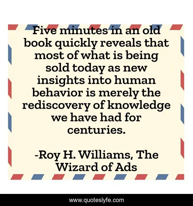 This page presents the quote "Five minutes in an old book quickly reveals that most of what is being sold today as new insights into human behavior is merely the rediscovery of knowledge we have had for centuries.". Author of this quote is Roy H. Williams, The Wizard of Ads. This quote is about marketing, advertising, knowledge,.