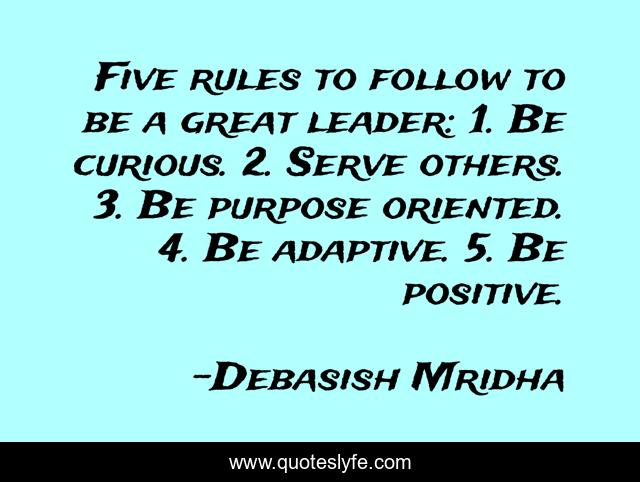 This page presents the quote "Five rules to follow to be a great leader: 1. Be curious. 2. Serve others. 3. Be purpose oriented. 4. Be adaptive. 5. Be positive.". Author of this quote is Debasish Mridha. This quote is about leadership-skills, how-to-be-a-leader, philosophy, debasish-mridha, quotes, inspirational, be-a-great-leader, enthusiasm, debasish-mridha-m-d,.