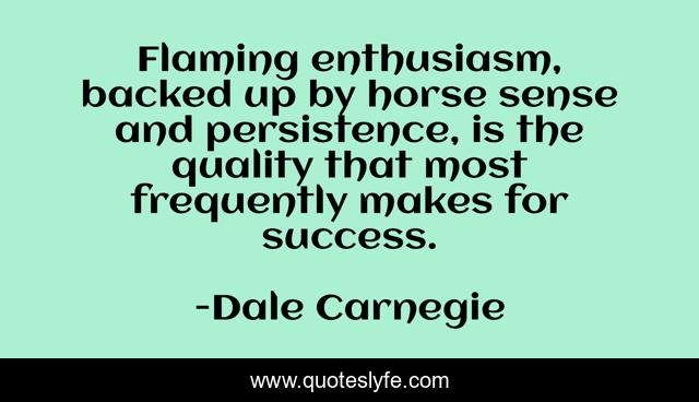 This page presents the quote "Flaming enthusiasm, backed up by horse sense and persistence, is the quality that most frequently makes for success.". Author of this quote is Dale Carnegie. This quote is about horse, quality, persistence,.