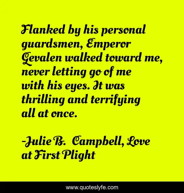 This page presents the quote "Flanked by his personal guardsmen, Emperor Gevalen walked toward me, never letting go of me with his eyes. It was thrilling and terrifying all at once.". Author of this quote is Julie B. Campbell, Love at First Plight. This quote is about perspective-book-series, irys-godeleva, julie-b-campbell, love-at-first-plight, ya-fiction, young-adult-fiction, ya-series, young-adult-fantasy, young-adult-series,.