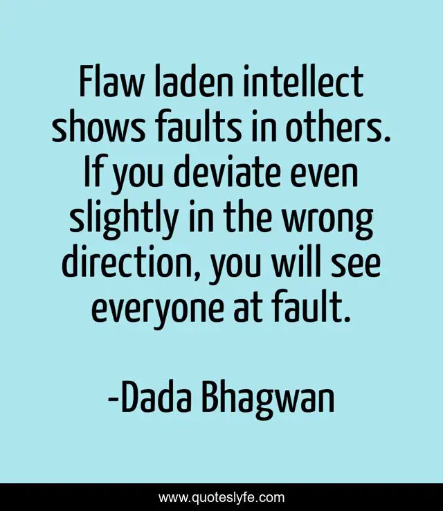 This page presents the quote "Flaw laden intellect shows faults in others. If you deviate even slightly in the wrong direction, you will see everyone at fault.". Author of this quote is Dada Bhagwan. This quote is about fault, spiritual, intellect, faults,.
