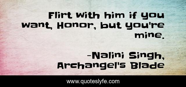 This page presents the quote "Flirt with him if you want, Honor, but you're mine.". Author of this quote is Nalini Singh, Archangel's Blade. This quote is about dmitri, honor,.