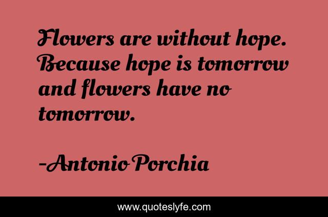 This page presents the quote "Flowers are without hope. Because hope is tomorrow and flowers have no tomorrow.". Author of this quote is Antonio Porchia. This quote is about flowers, tomorrow, hope,.