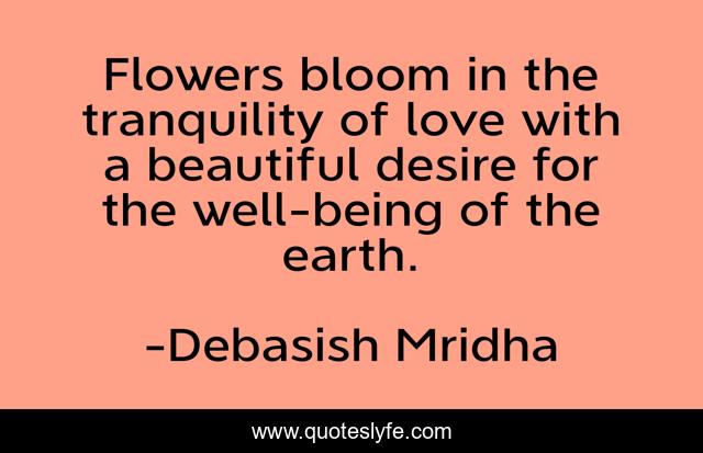 This page presents the quote "Flowers bloom in the tranquility of love with a beautiful desire for the well-being of the earth.". Author of this quote is Debasish Mridha. This quote is about beautiful, tranquility, philosophy, debasish-mridha, quotes, inspirational, enthusiasm, well-being-of-the-earth, debasish-mridha-m-d,.