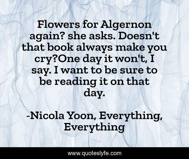 This page presents the quote "Flowers for Algernon again? she asks. Doesn't that book always make you cry?One day it won't, I say. I want to be sure to be reading it on that day.". Author of this quote is Nicola Yoon, Everything, Everything. This quote is about nicola-yoon, everything-everything, books, page-14, flowers-for-algernon,.