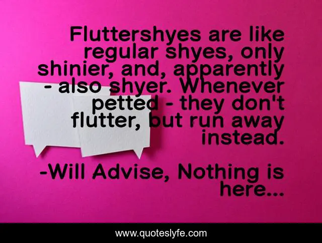 This page presents the quote "Fluttershyes are like regular shyes, only shinier, and, apparently - also shyer. Whenever petted - they don't flutter, but run away instead.". Author of this quote is Will Advise, Nothing is here.... This quote is about shine, running-away, run, shoes, meow, alternatively, butterflies, choices, shyness,.