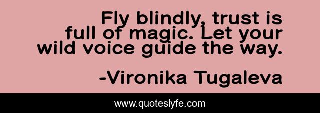 This page presents the quote "Fly blindly, trust is full of magic. Let your wild voice guide the way.". Author of this quote is Vironika Tugaleva. This quote is about inner-voice, magic, be-yourself, inner-guidance, trust-yourself, be-wild, wild, trust,.