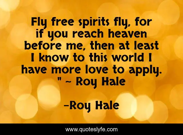 This page presents the quote "Fly free spirits fly, for if you reach heaven before me, then at least I know to this world I have more love to apply. " ~ Roy Hale". Author of this quote is Roy Hale. This quote is about self-awareness, spiritual-sayings, spiritual-life, spirituality,.