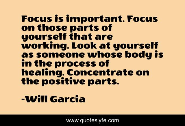 This page presents the quote "Focus is important. Focus on those parts of yourself that are working. Look at yourself as someone whose body is in the process of healing. Concentrate on the positive parts.". Author of this quote is Will Garcia. This quote is about positive, confidence,.