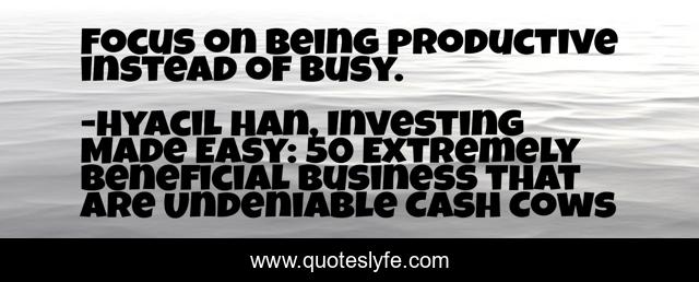 This page presents the quote "Focus on being productive instead of busy.". Author of this quote is Hyacil Han, Investing Made Easy: 50 Extremely Beneficial Business that are Undeniable Cash Cows. This quote is about business-and-money, mutual-funds-and-funding, finance-and-course, cash, investing-basic, investment-guide, future, rich,.